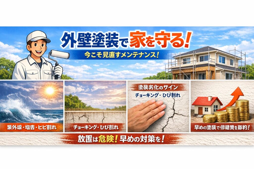 外壁塗装というと、「色が褪せてきたからそろそろかな」「10年たったらやるもの」というイメージを持つ方が多いものです。しかし実際には、外壁塗装は❝家の寿命を延ばすためのメンテナンス❞であり、適切なタイミングで行うことで将来の修繕費を大きく抑えることができます。